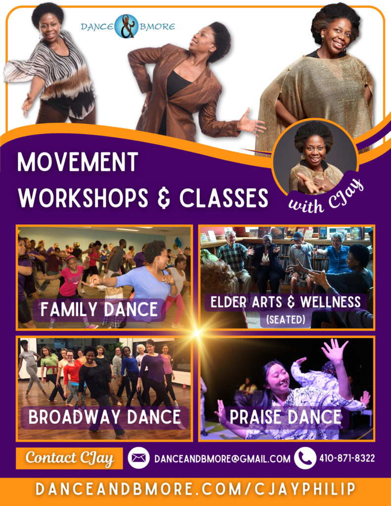 CJay Philip is Artistic Director of Dance & Bmore, an innovative company that fuses music, movement, and storytelling to bridge generations – connecting youth, families, and elders through the transformative power of the arts. Dance & Bmore also designs innovative multigenerational programs to stimulate the imagination and strengthen relationships while building a sense of community and well-being.