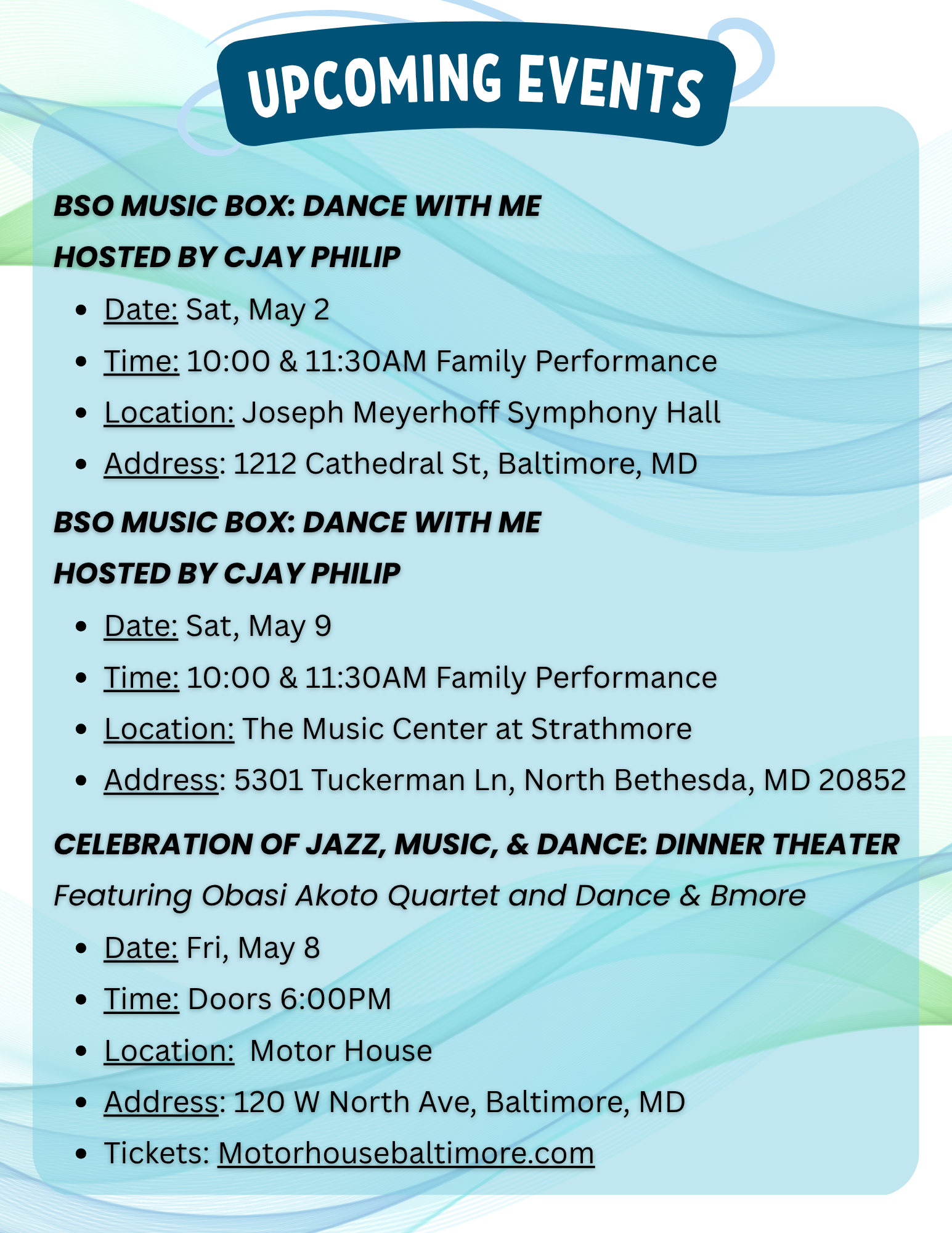 Join us for an uplifting evening of music, movement, and storytelling that celebrates the heart and soul of our city. Under the direction of CJay Philip, the Dance & Bmore Ensemble shines in this joyful showcase of local talent, Broadway classics, and community spirit.