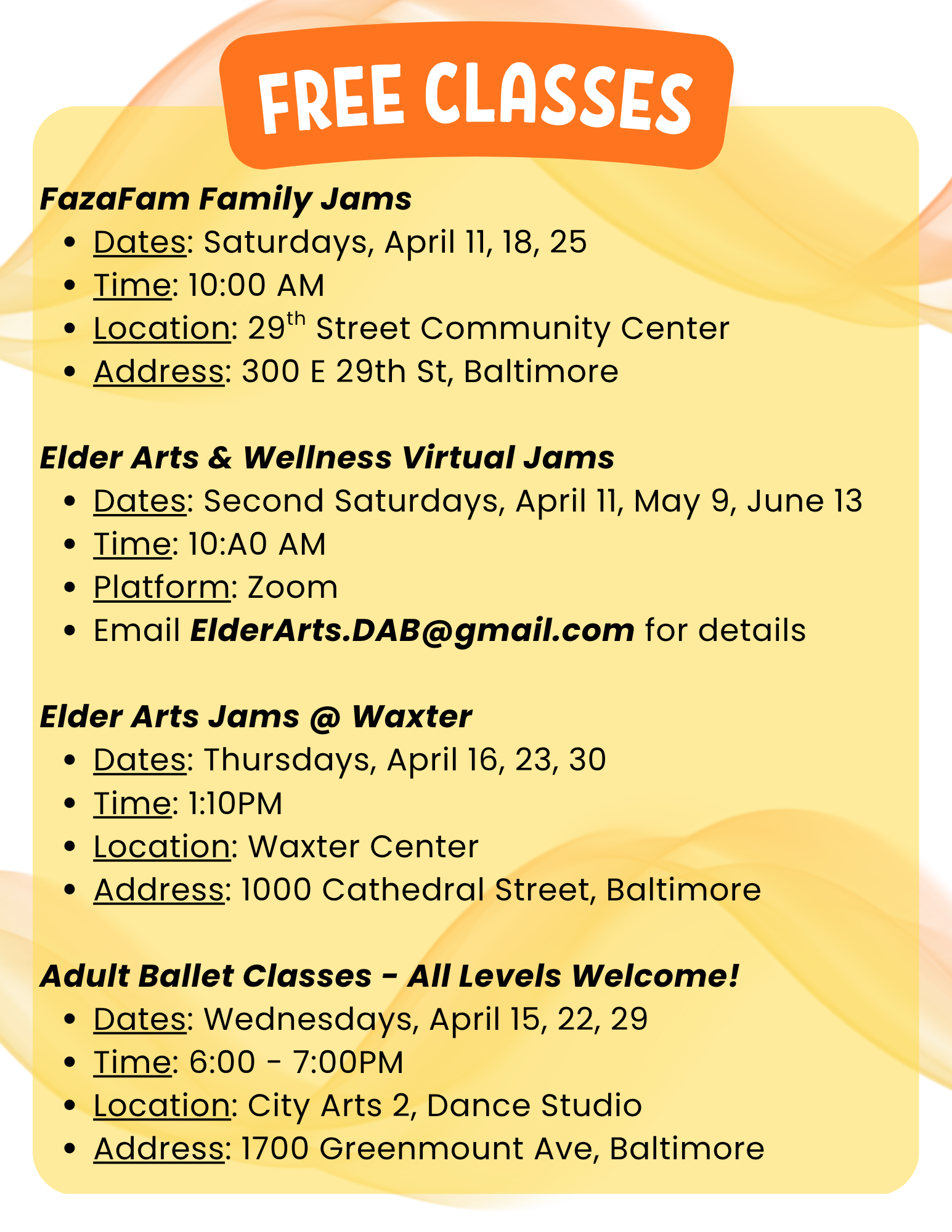 • Location: City Arts 2, Dance Studio, 1700 Greenmount Ave, Baltimore, MD 21218